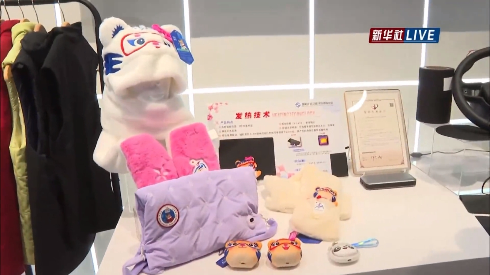 在創新中(zhōng)心展廳裏,陳列著亞冬會的吉祥物(wù)濱濱(bīn)和妮妮,長按吉祥物胸前的按鈕,濱濱(bīn)和妮妮就會變成一個暖娃(wá)娃(wá);亞(yà)冬會的(de)特許商品圍巾,連接充電寶打開開關(guān),就可以為脖子提供溫暖保護;一款可(kě)以自加熱的馬甲,通過手機小程(chéng)序和口袋內置開(kāi)關就可以實現輕薄又保暖;加熱方向盤可減(jiǎn)少(shǎo)電車用(yòng)於發熱的電量消耗,讓電車可以跑得更遠一點;以北京冬奧會冰墩墩(dūn)的形象製成的(de)暖手寶,可愛又小巧。